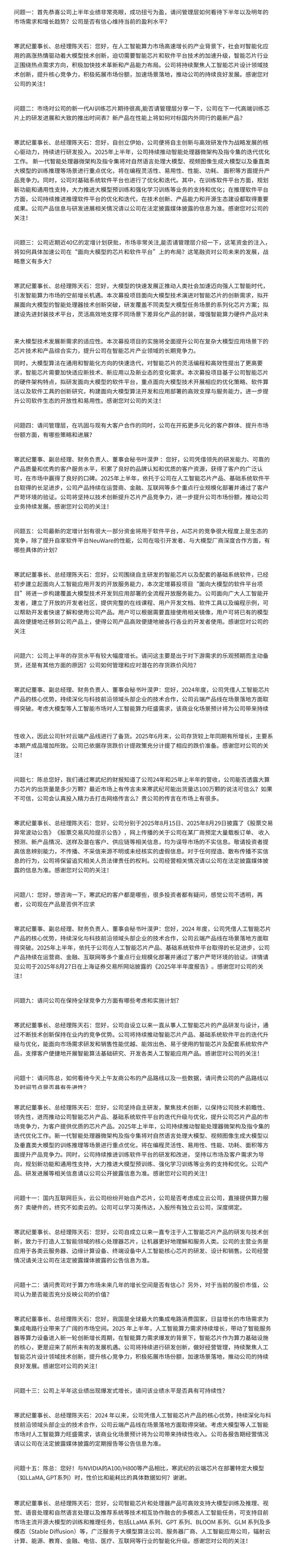 陈天石称,2025年上半年,公司持续推动智能处理器微架构及指令集的迭代优化工作。